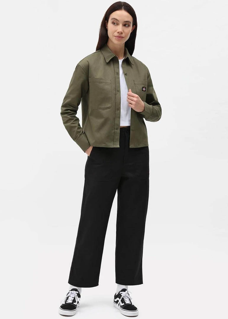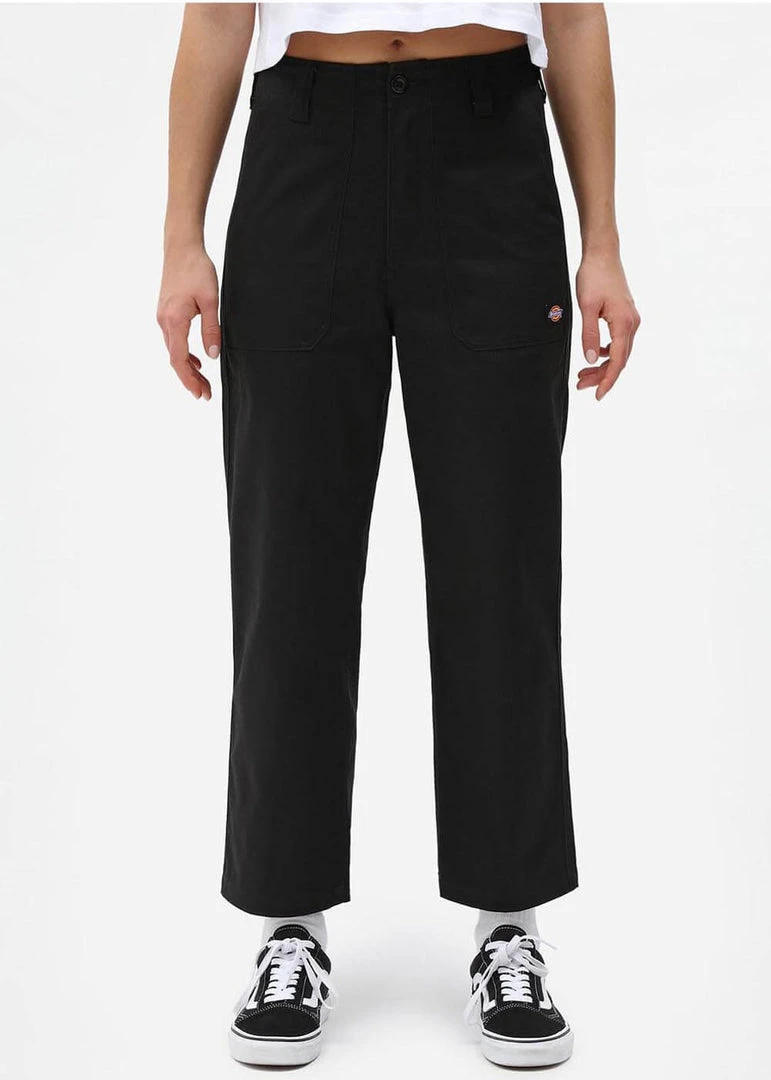 She has 2 back pockets, 2 patch pocketson the hip and she closes in the front with a zipper and button. The Dickies label can’t be missing.