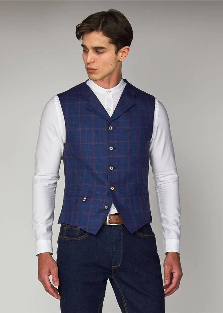In the Rupert waistcoat you’ll look like a true gentleman with it’s checkered pattern and wintery yet strikingly cheerful blue and red. Made of a beautiful quality linnen and wool mix it’s perfectly appropriate for spring and summer! It closes with 5 buttons on the front and has 3 pockets, which you first need to carefully pry open.