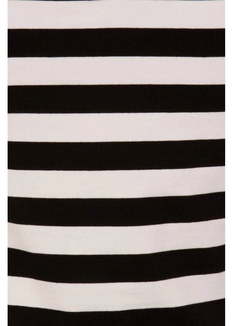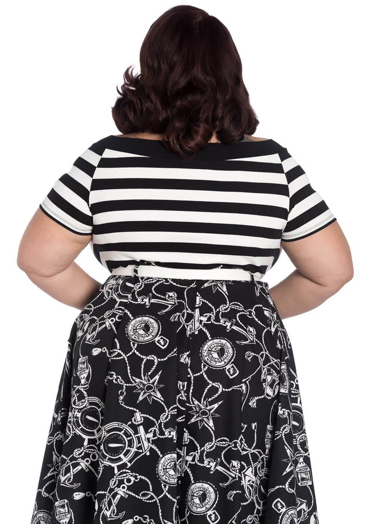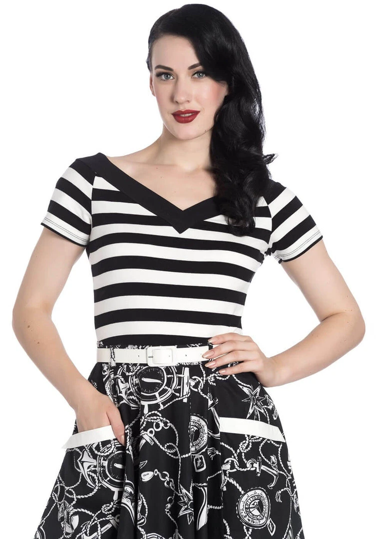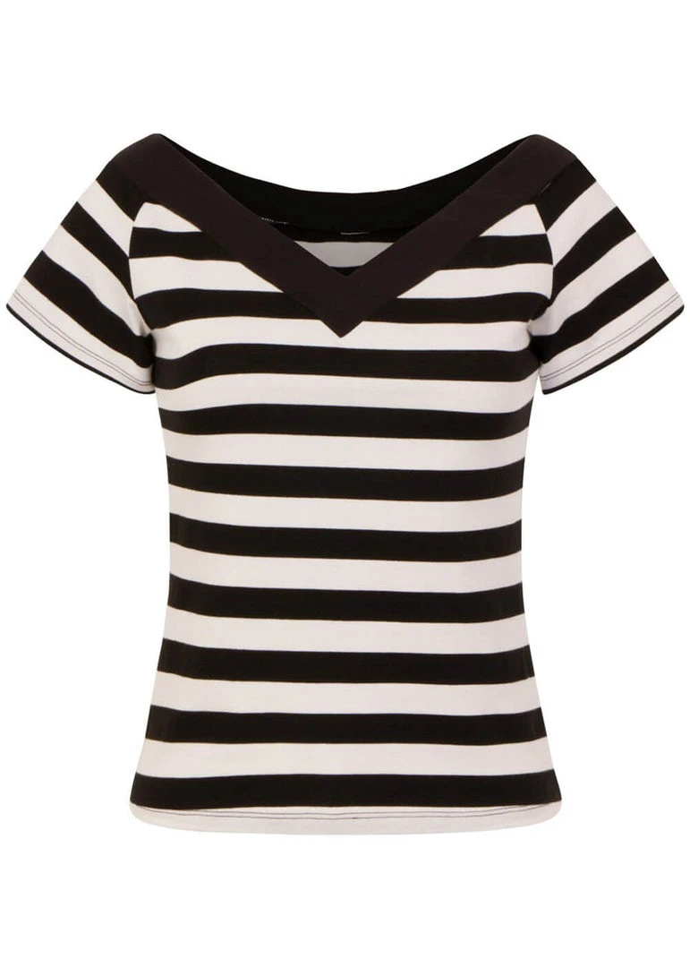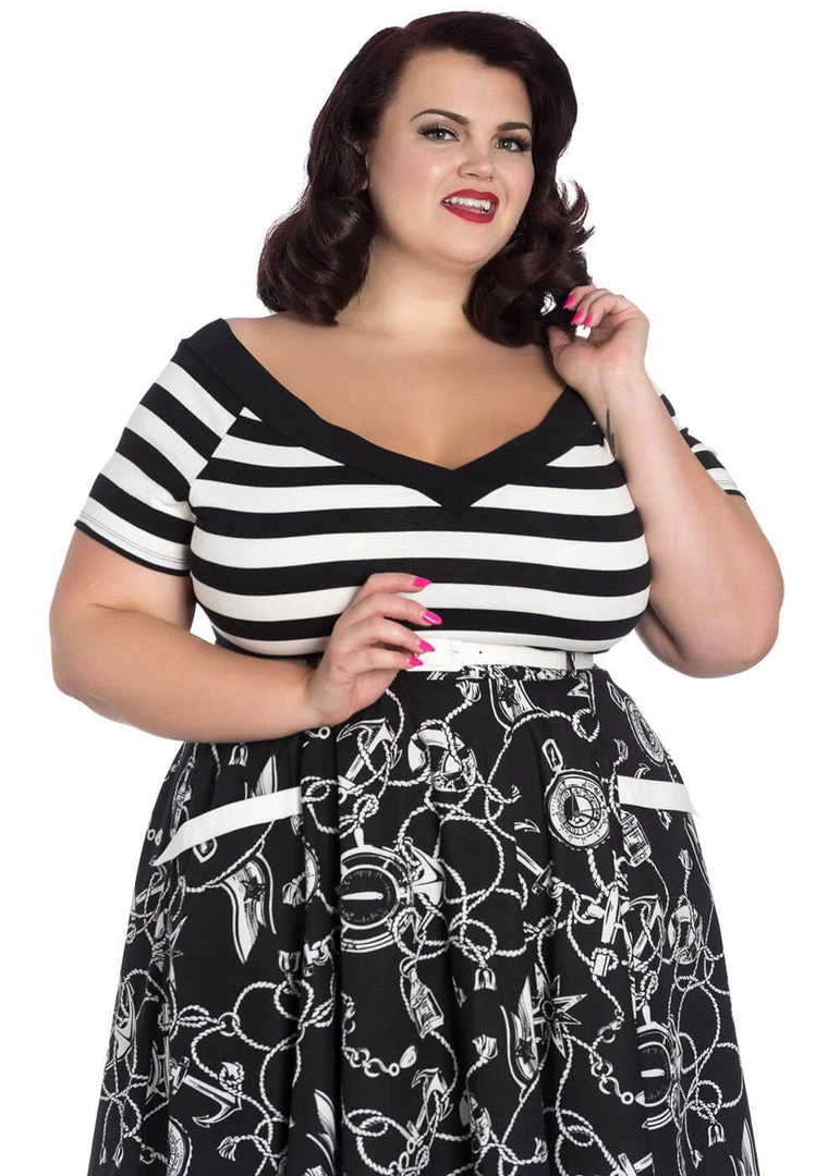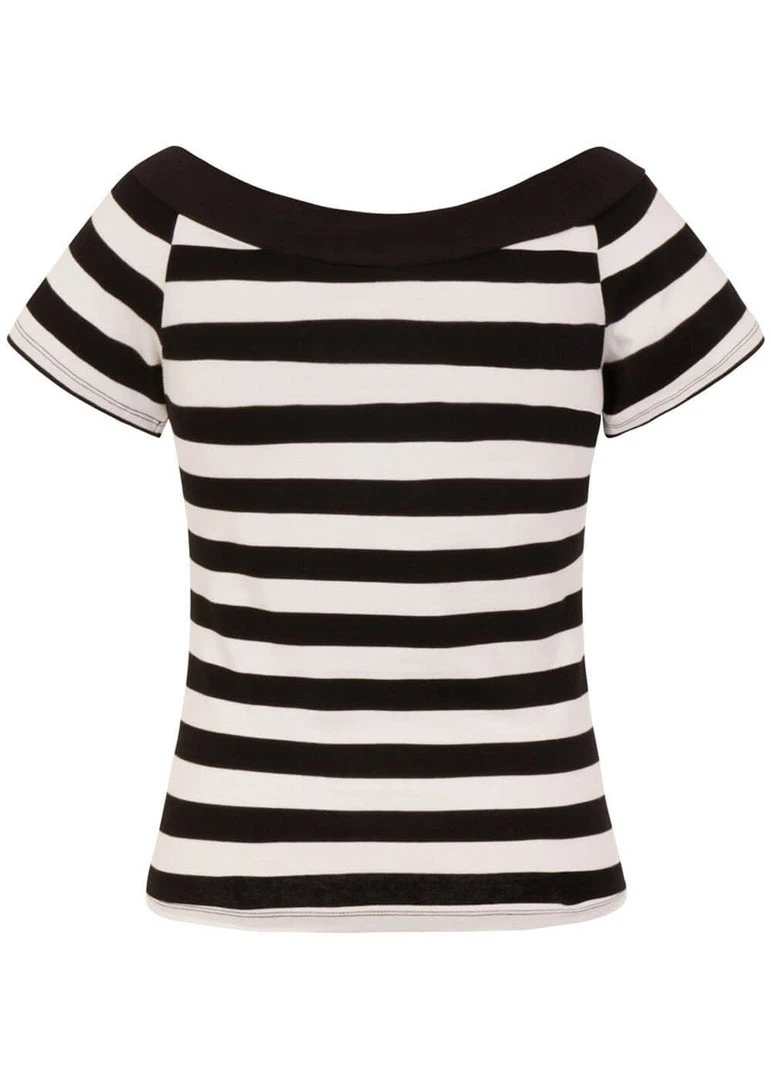 It’s an unmistakable classic in all of our wardrobes: the well known black/white stripe! Hell Bunny brings us this lovely stretchy version, which is playfully open across the shoulders. Because of her lovely cotton mix you’ll want to wear her with every look, and nobody is stopping you 😉