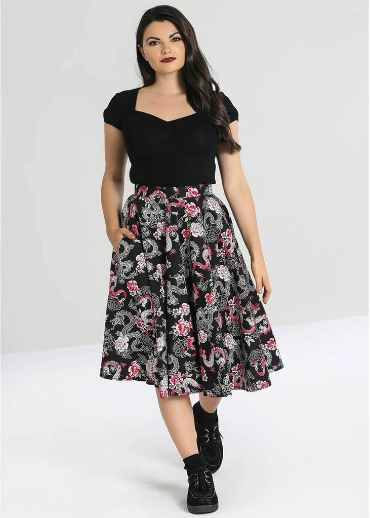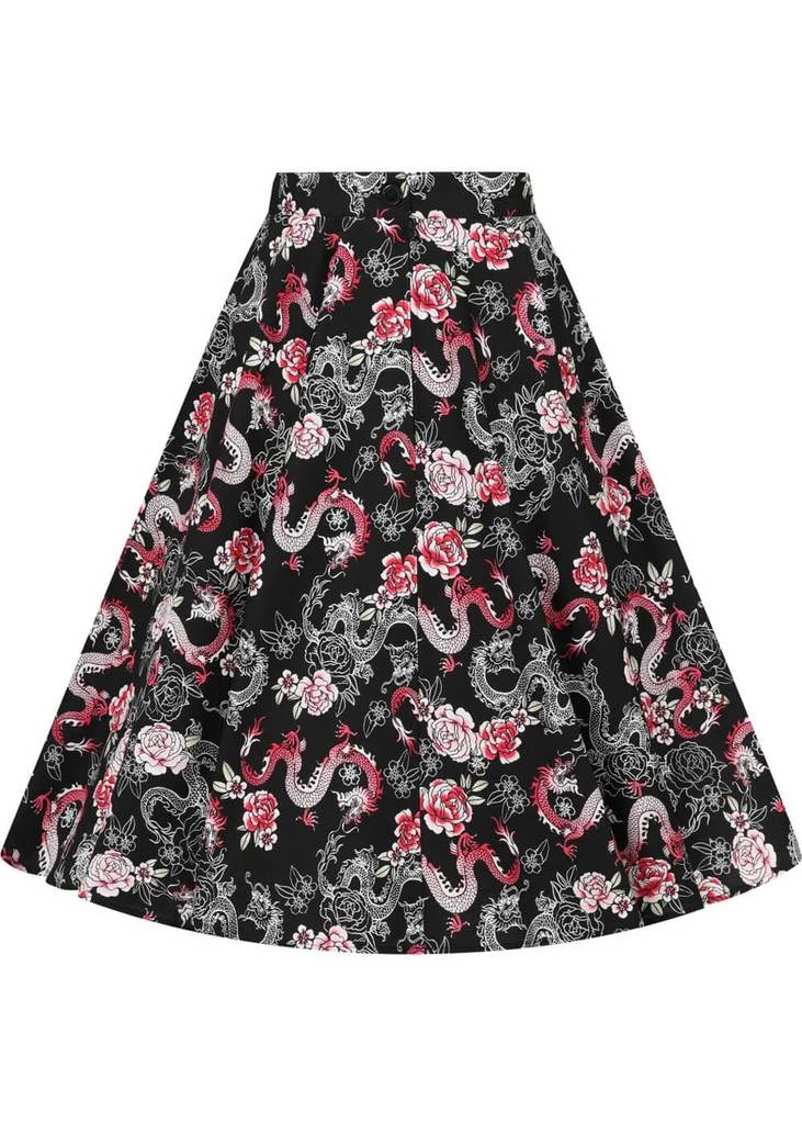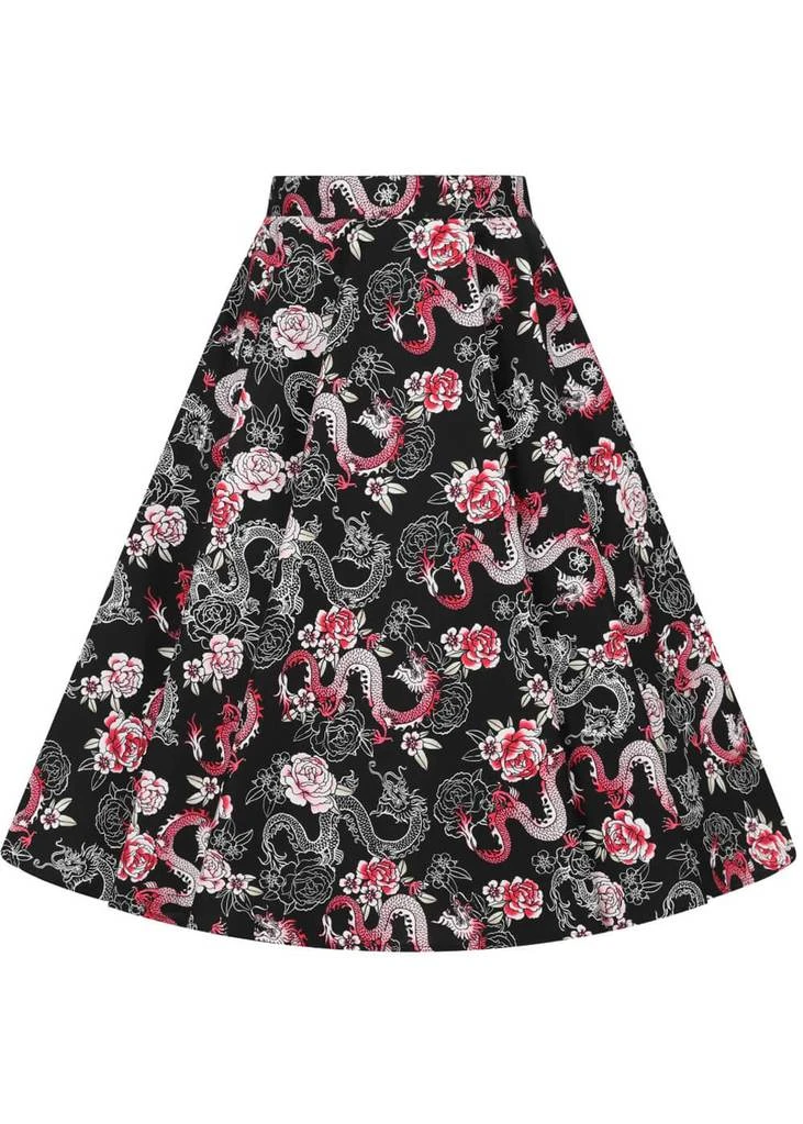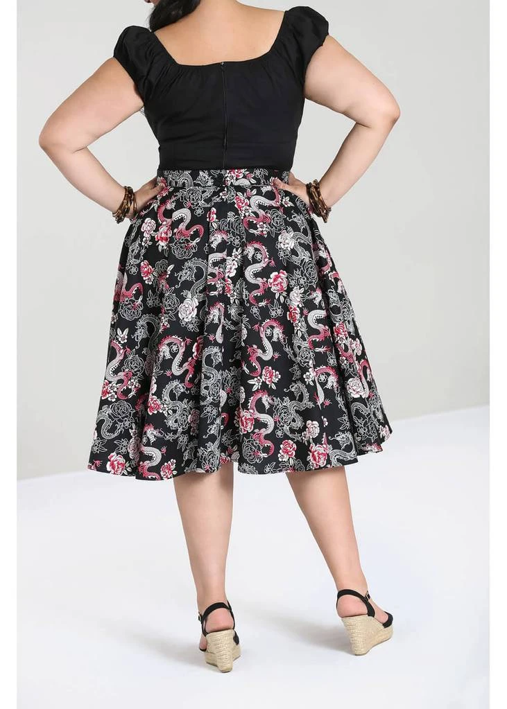 This cutie is made of an airy cotton with no stretch and from the waistband down she flares out into a full circle skirt with pockets(!), making it so the dragons almost fly off when you swing! Perfect ofcourse to wear with one of our petticoats to make those dragons fly. With a height of 1,70 she reaches down below the knee and closes with a zipper and button on the back.