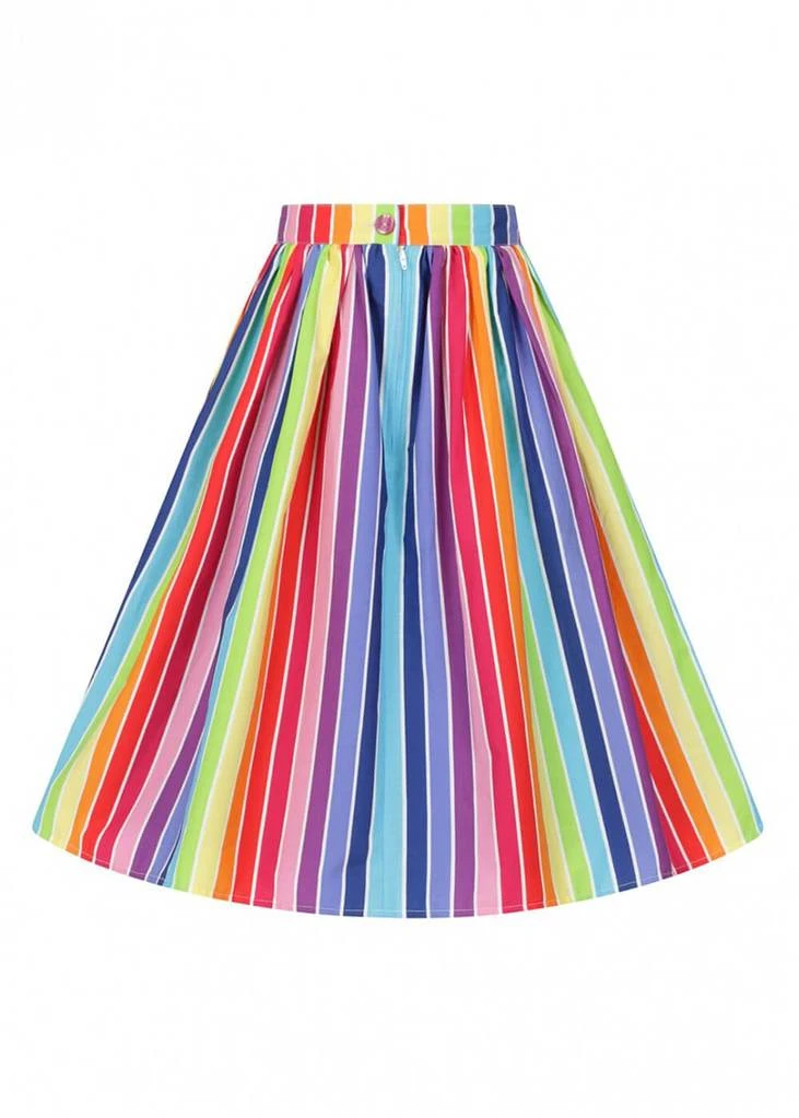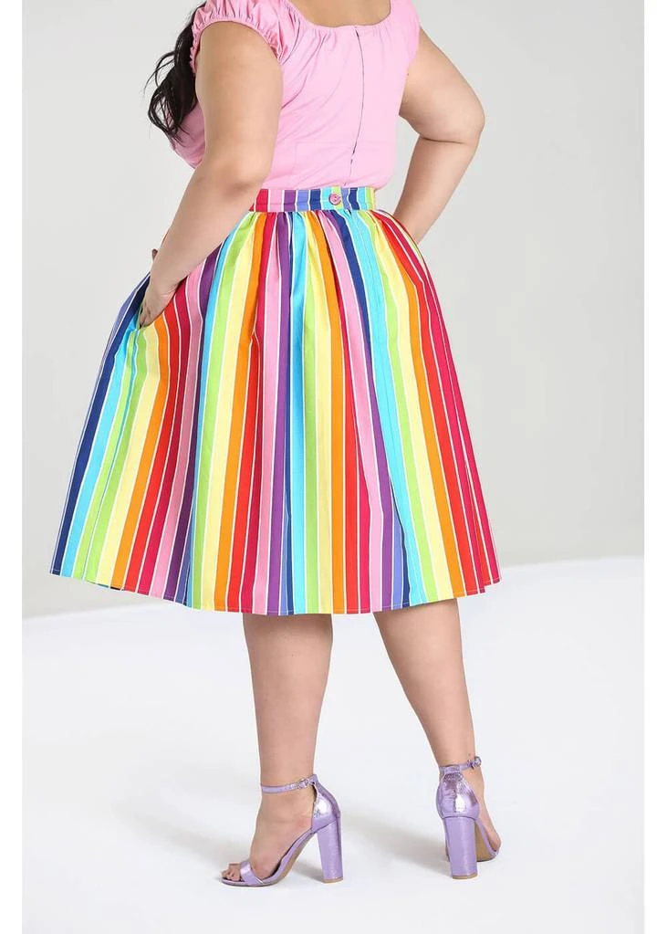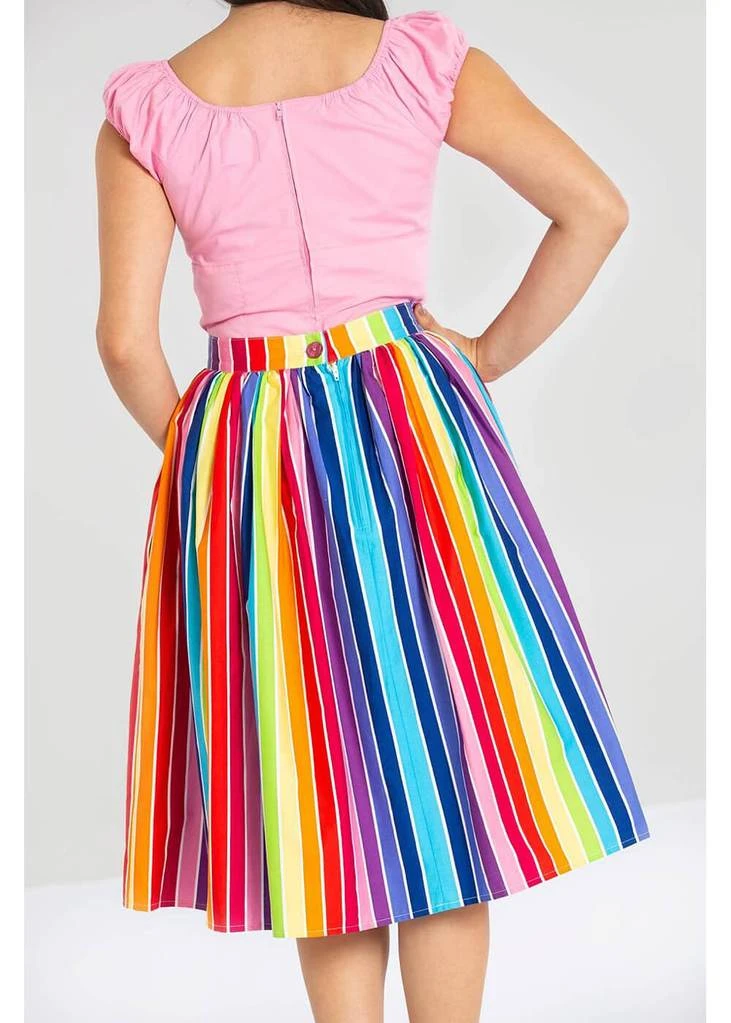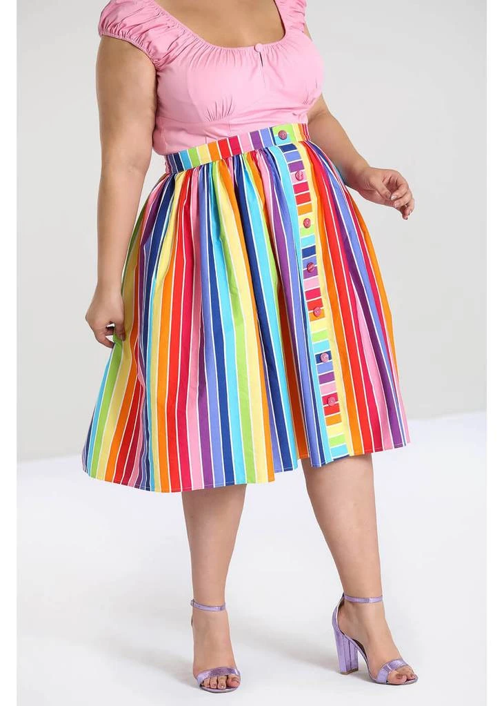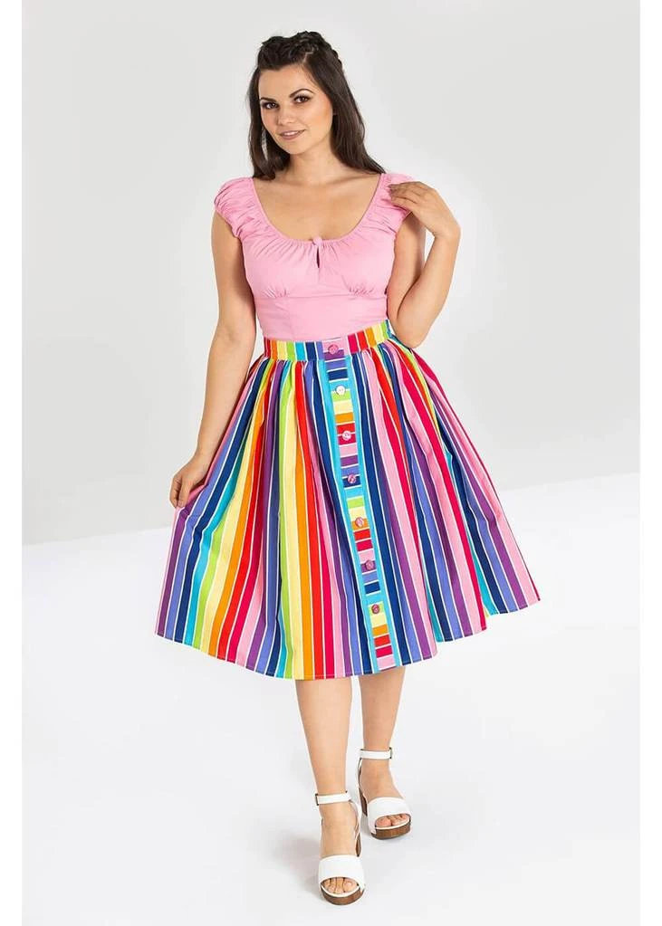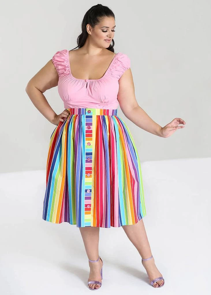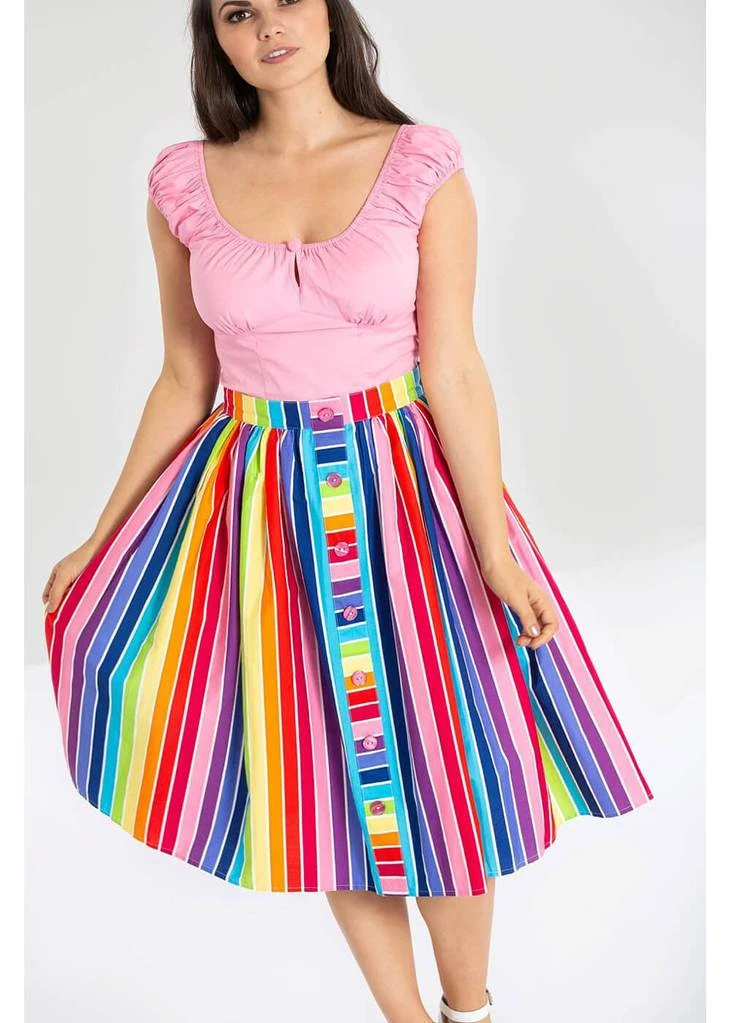 Even the decorative buttons across the front have a stripe! Down from the waistband she flares out through pleats into a full skirt with pockets, and is perfect for combining with one of our petticoats