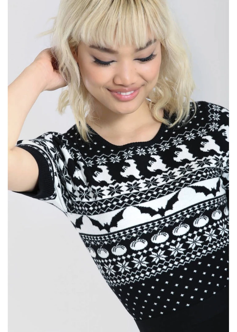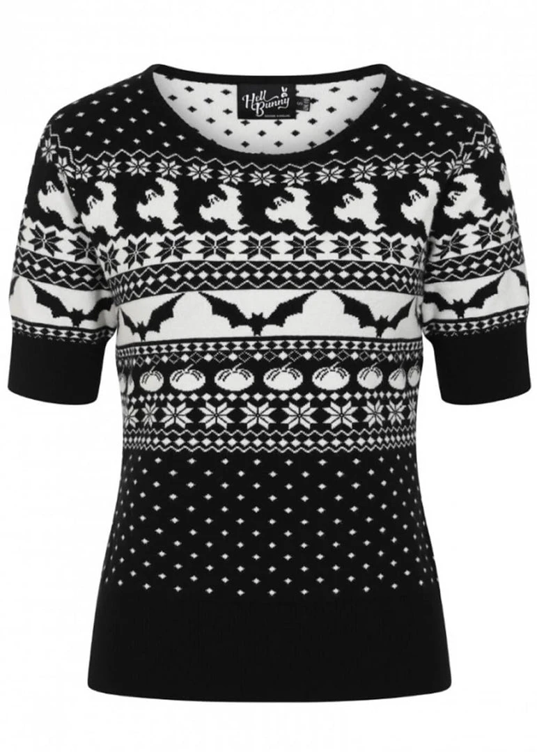 Bats, ghosts and pumpkins, you can find them all on this lovely soft jumper made of a knitted viscose-mix with stretch, which makes you pull her out of the closet all year round. The ribbed seams on the sleeves and bottom ensure a beautiful fit.