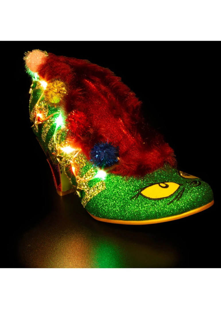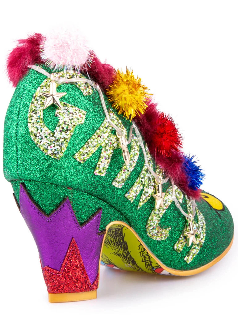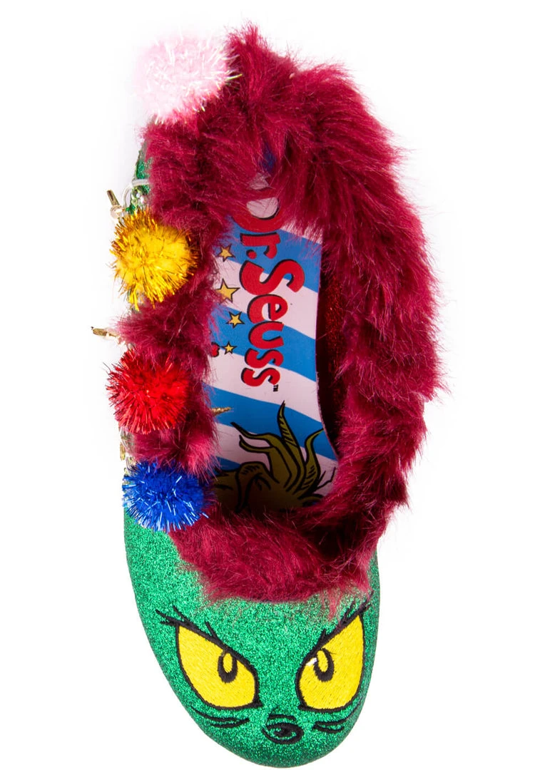 Glitters, tinsel pompoms, faux-fur and real fairy lights, these pumps are Christmas on your feet! The rechargeable lamps can enlighten your feet in 3 different ways: on, blinking slowly and blinking fast, and if you don’t feel like lights you simply turn them off. From the background of green glitters, the Grinch’s embroidered yellow eyes are looking at you from the front of the shoe and his name is sparkling on the sides. The opening has an edge of soft red faux-fur, that is adorned with shimmering pompoms in different colours. Even the heel is decorated with glitters!