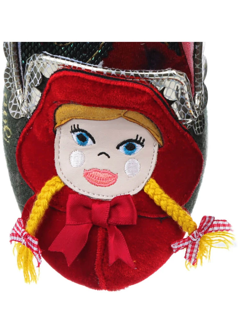 Wherever she is, he’s not far away! Threateningly, he’s waiting on the tip of one and at the heel of the other shoe, while Little Red Riding Hood is just on the other side… The shoe itself is covered in tartan and has a fine heel, that is also nicely wide. Charming, yet super comfortable! The big embroidered questions on the sides complete the story. The shoes are narrowing towards the heel, so you don’t slip out as easily.