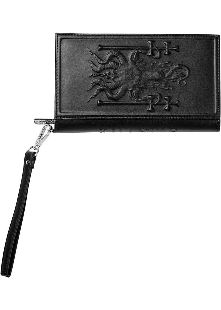 This gem has a stunning devil-relief on a wallet of high quality vegan leather, that keeps its shape nicely. She also has a short detachable handle, so you can wear her as a cluch.