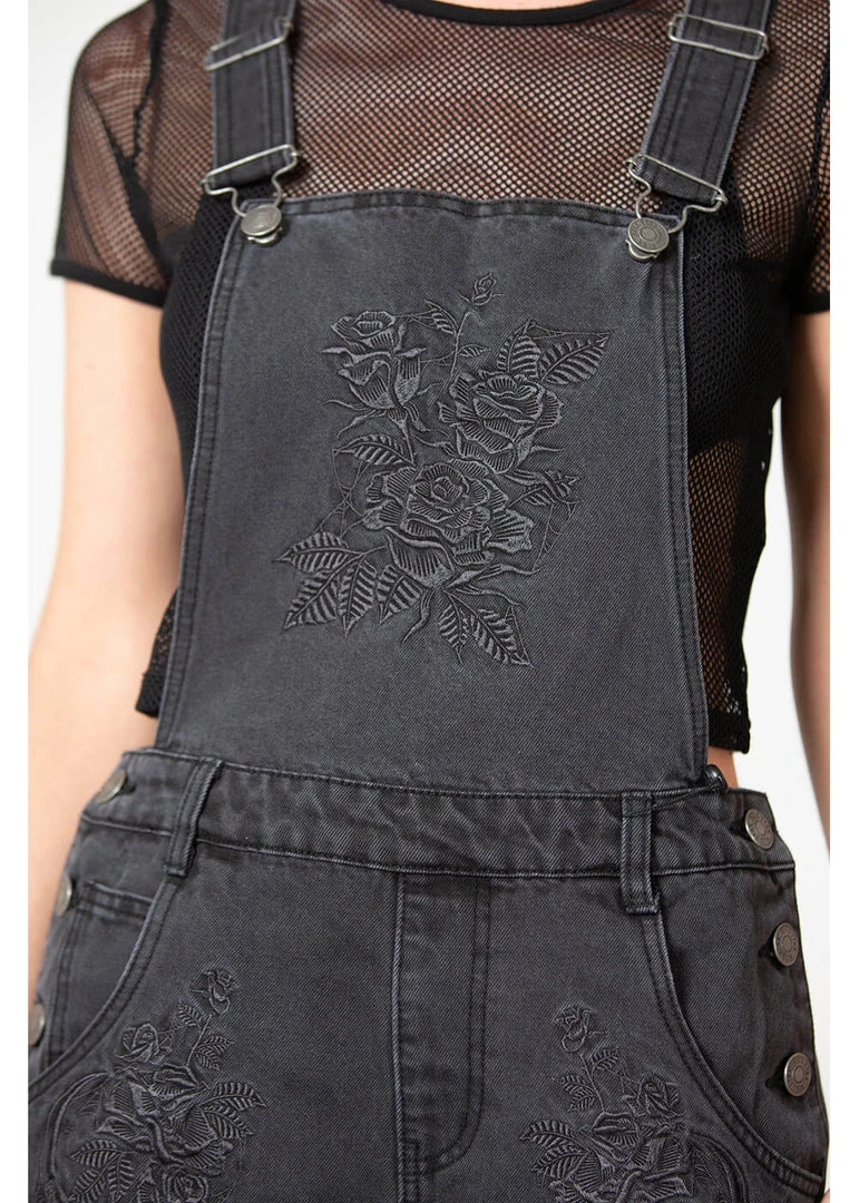 They’re romantically embroidered on the flap and the legs: roses! This beauty is made of denim-look cotton without stretch, that is lovely to wear. The flap is connected to the high back through adjustable shoulder straps.