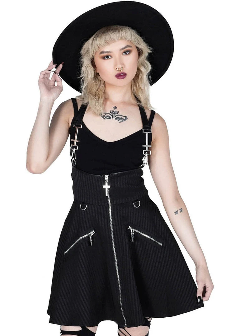 New In Killstar Dark Flair Skirt With Suspenders Black Pinstripe