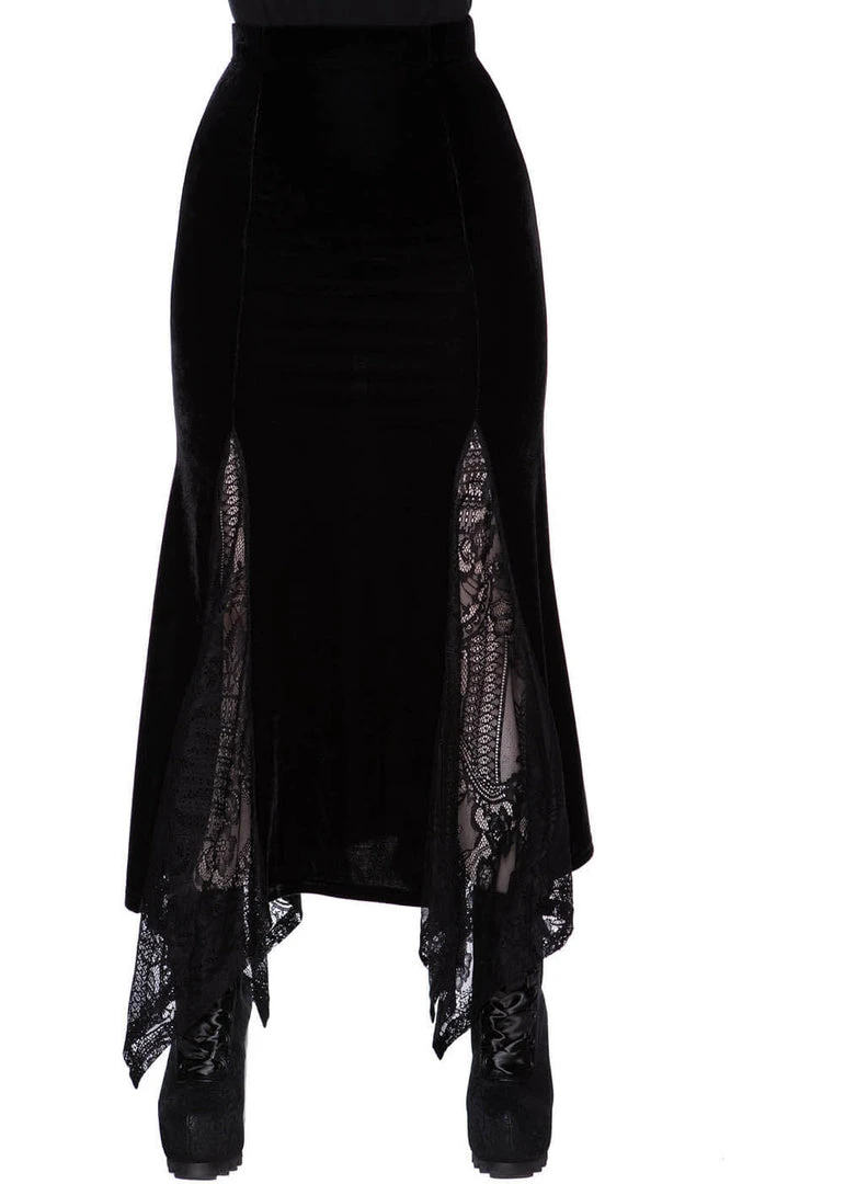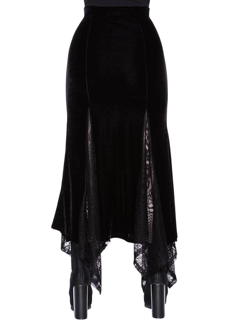 Her pitchblack velvet is incredibly soft and perfect for teh summer with her black lace insets… She has slight stretch, which makes her a beautiful nightmare to wear and puts your curves in the perfect light. The bottom seam is uneven, for an extra sassy effect when you walk! You can simply slip into her, thanks to the elastic waistband, be sure to check the sizing chart so the waistband fits over your hips 😉