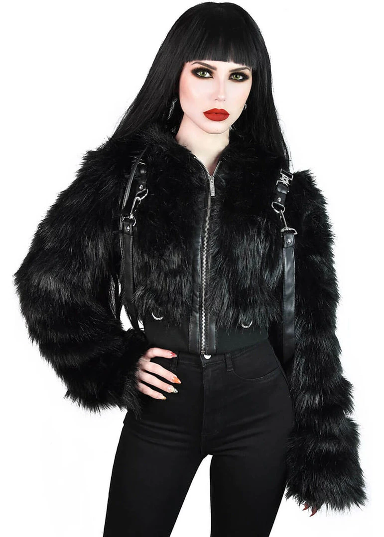 This fuzzy short model is so soft, you’ll never want to take her off again, and if you really want to dive into her you simply pull up the big hood 😉 The faux-leather straps are easily detachable, the pentagram details can’t be detached. She closes with a zipper in the front.