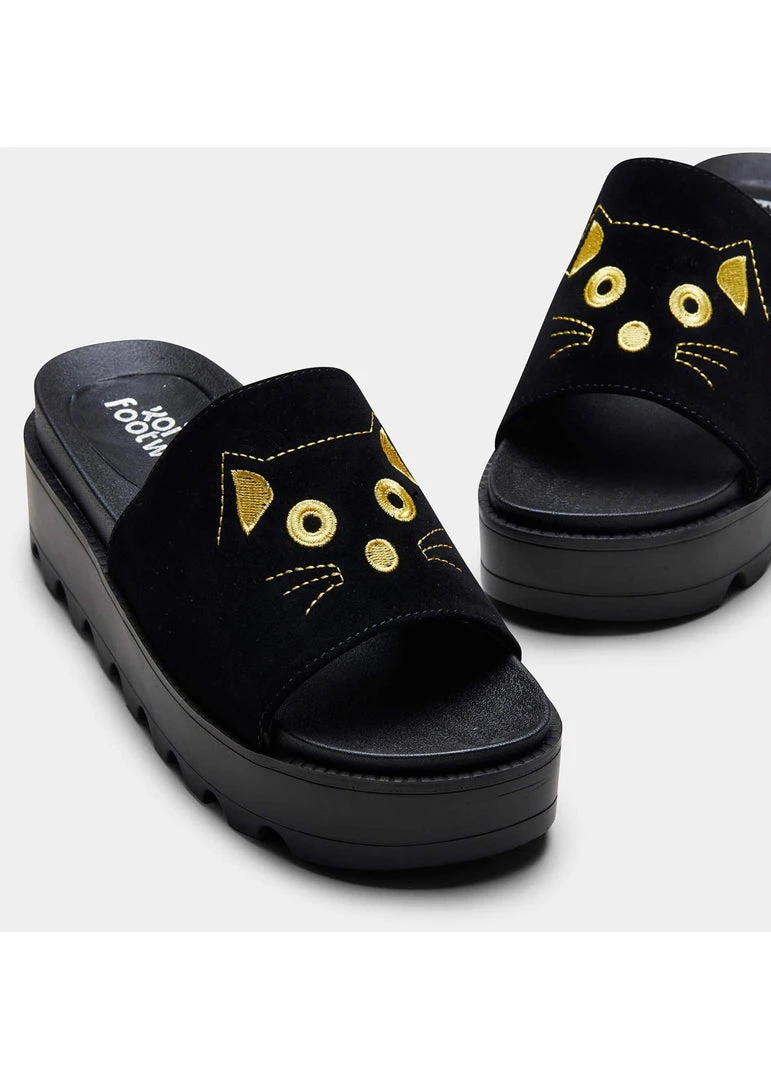 Every step you make those embroidered kitty faces are staring back at you! These playful slides are covered in soft faux-suede, making them extremely pettable 😉 The 4,5 cm heel feels amazingly comfortable because of her 3,5 cm thick sole. These cuties are perfect for taking a stroll, or as stylishly convenient ‘let’s pop these on and go’ slides.