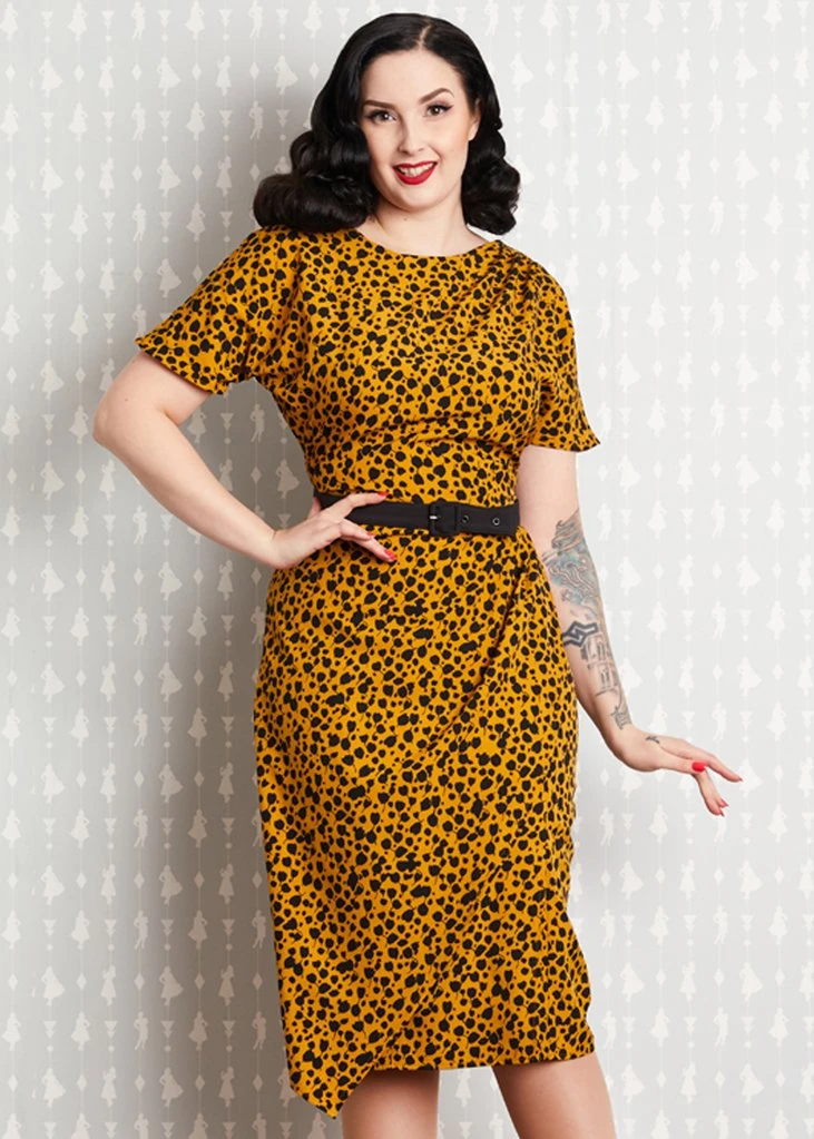 Her deep mustard is covered with spots that a leopard wouldn’t mind stealing. Filomena is a cutie, with her short sleeves with a pleated edge and playful pleats in the bodice. An extraordinary detail is that extra layer over the skirt, for a summery sarong look that playfully protrudes.