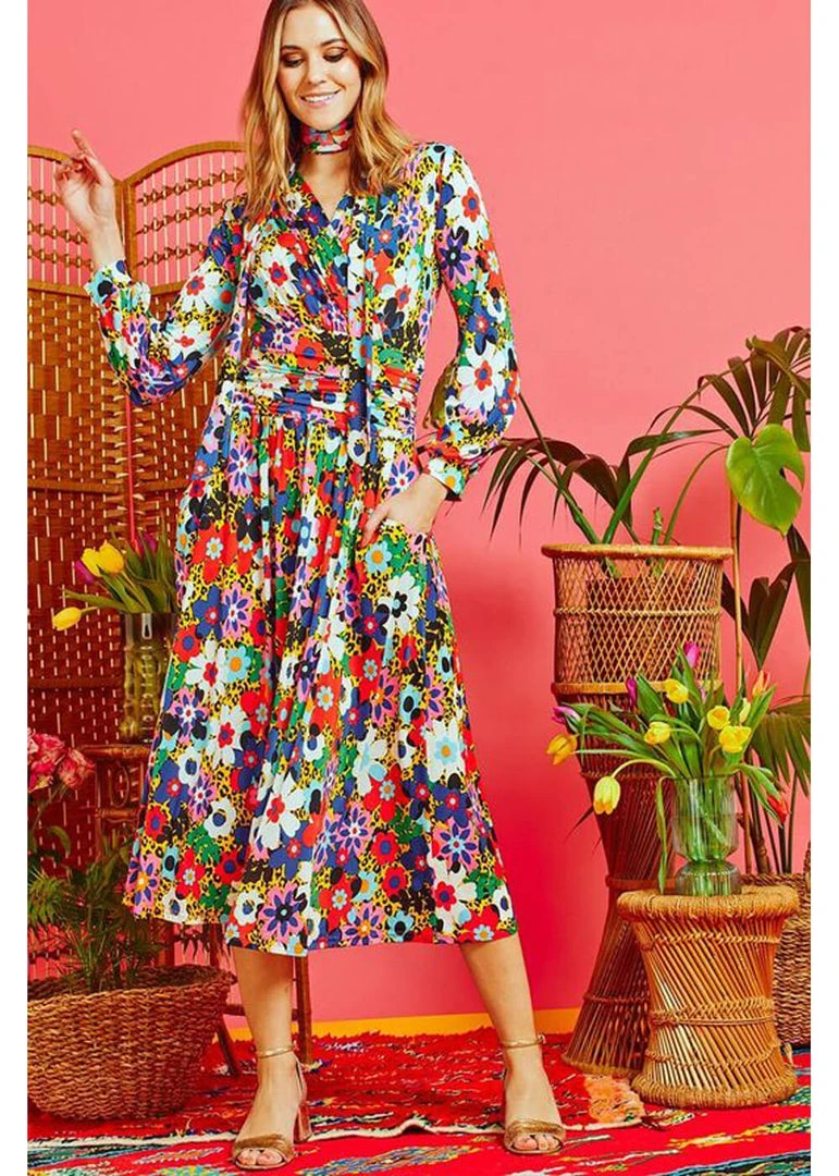 The bodice has a wrap and an elegant draping because of the pleats by the shoulders. The waist is pleated aswel, downwards she flares out into a playful skirt which with a height of 1,70 reaches halfway down the calves. She even has pockets!