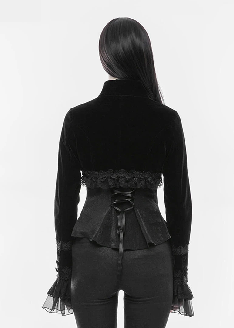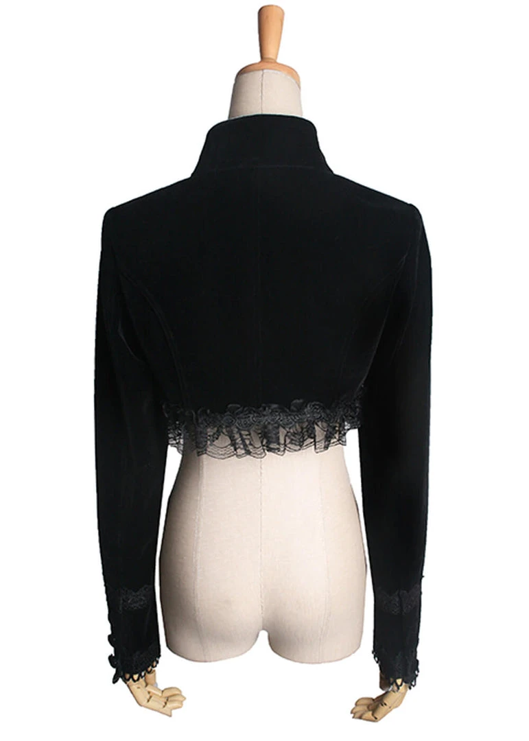 With her pitchblack velvet without stretch and the lace edges, this shrug is a literal topper! The bolero-model is open in the front and has a frog closure on the high collar.