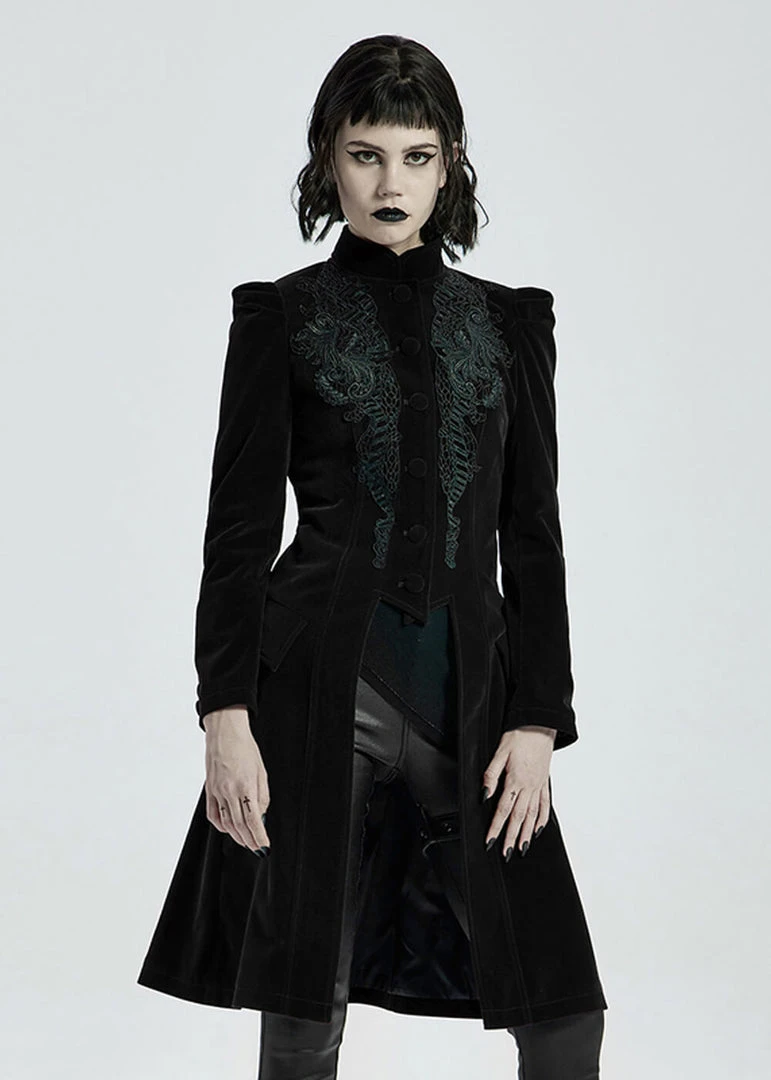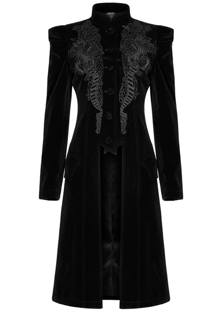 This coat is loaded with details like the puffy shoulders, and the long sleeves with decorative buttons. The waist is accentuated by carefully tightening the lacing in the back.
