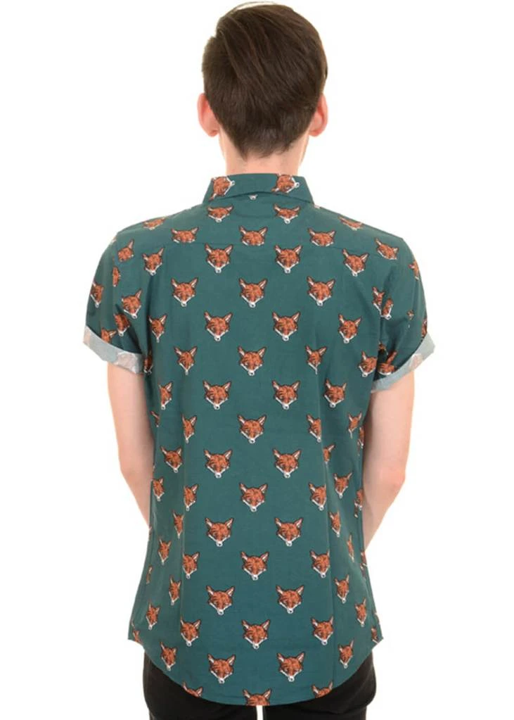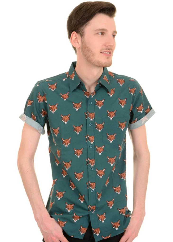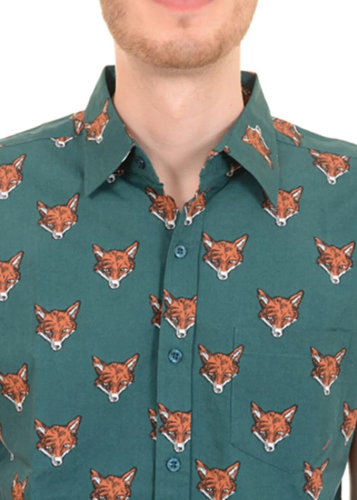 These festive shirts are made of 100% airy cotton and will catch some looks from a distance thanks to that brilliant motive of fox heads on a green background. It has a collar, open chest-pocket and closes with the smooth buttons on the front.