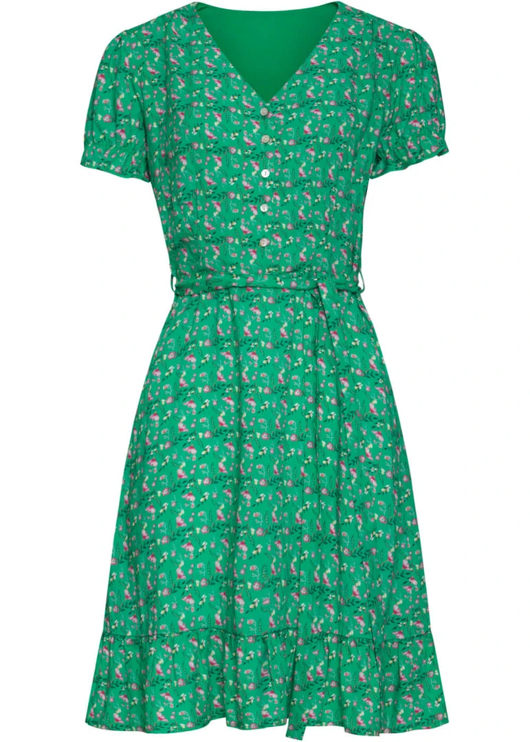 Lovely flowers on a lightweight, juicy green and lovely smooth rayon with slight stretch… Too good to be true? Yet it exists, and there is even more! Like playfully puffy short sleeves with fine elastic, and nice smooth buttons until the waist.