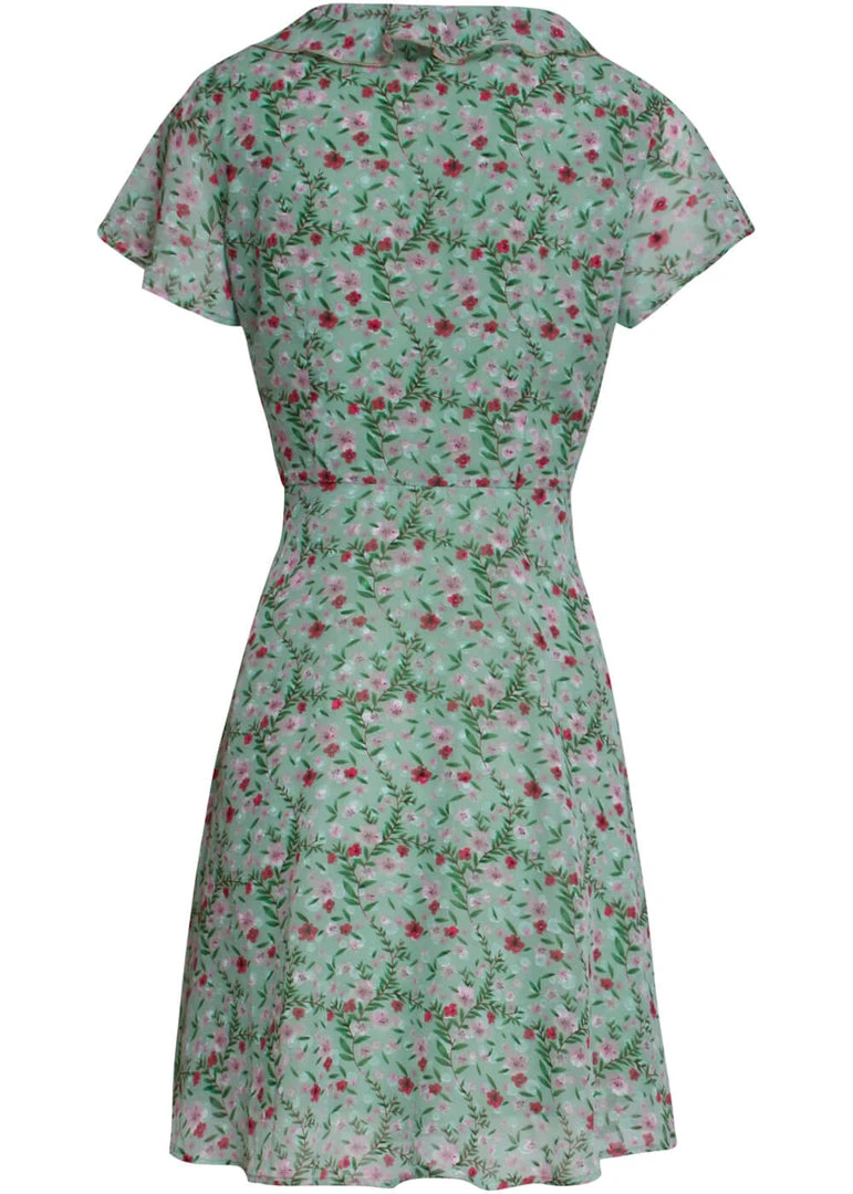 She is pure romance with her flower pattern on the semi-transparent fabric without stretch, the glossy details that look like soap bubbles floating over a flower meadown, and the dreamy model… A big ruffle runs along the soft v-neck and on to the waist, where you can tie a cute bow with the removable sash form the same fabric. She has gores for a stunning fit.