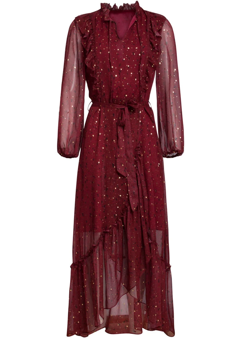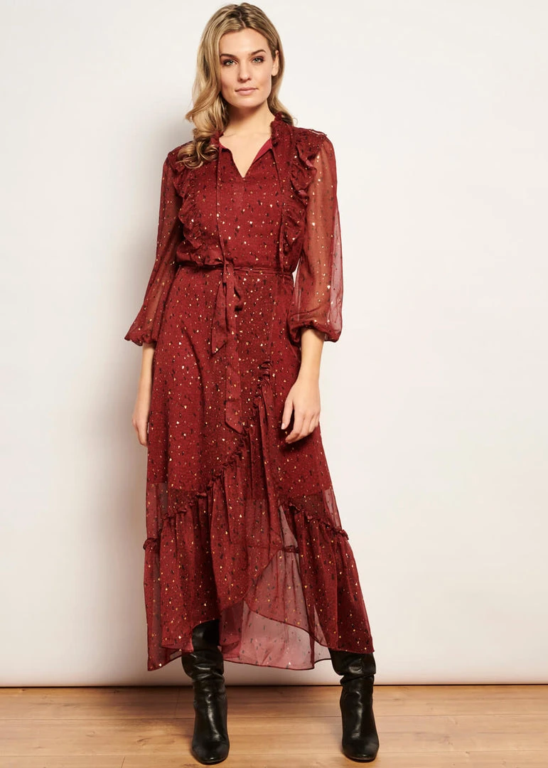 Her lovely pattern of black and golden spots on the semi-transparent fabric without stretch will definitely catch some attention. The sleeves are playfully puffy thanks to the gatherings at the shoulders and the fine elastic at the wrists. The neckline and the top itself are adorned with ruffles, for an extra romantic touch. She has an underdress until the knees, so you don’t show more than you want.