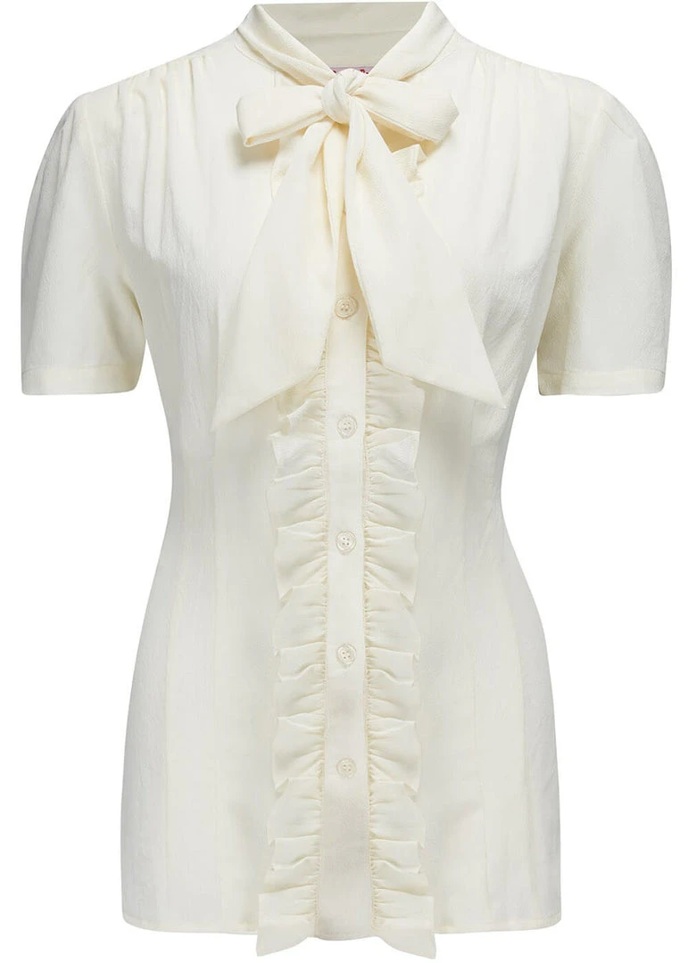 Betsy is the perfect example for the style of then, which is just as strong today: whether you’re in the meeting room or at home 😉 She closes with smooth buttons along the front, that become a showstopper with the ruffles on both sides of the row. Playful and stylish!