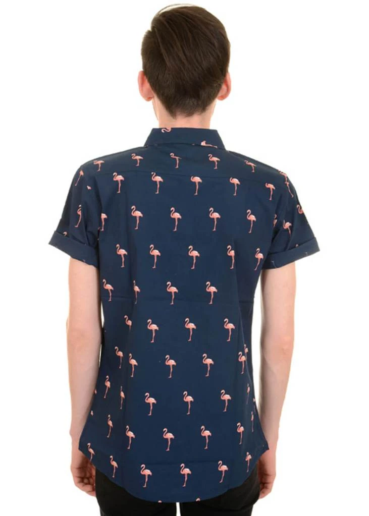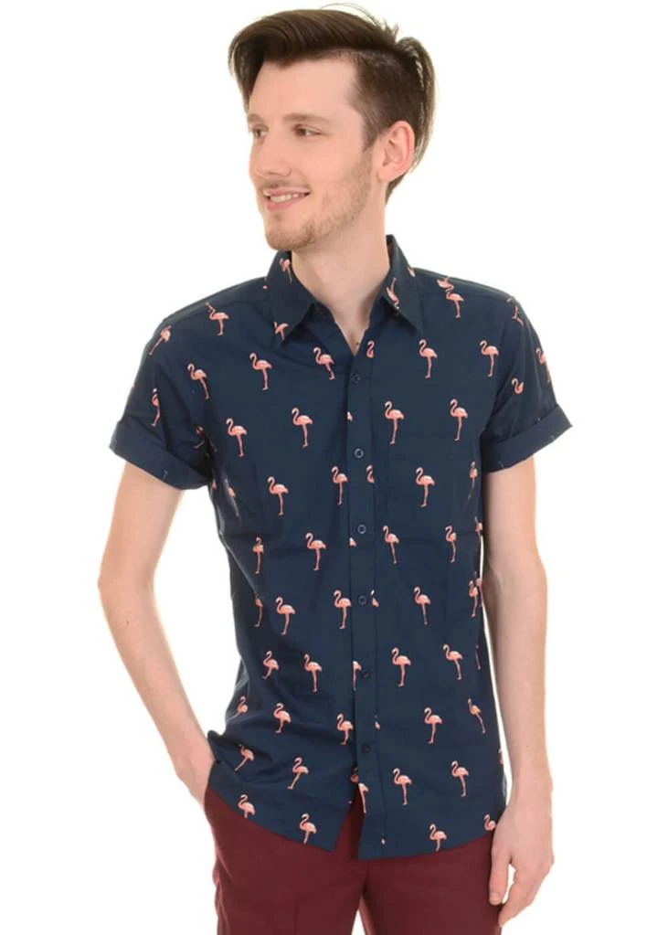 These festive shirts are made of an airy 100% cotton and will draw attention from a mile away thanks to that brilliant motive of flamingos on a navy background. It has a collar, open chest pocket and closes using the smooth buttons on the front.