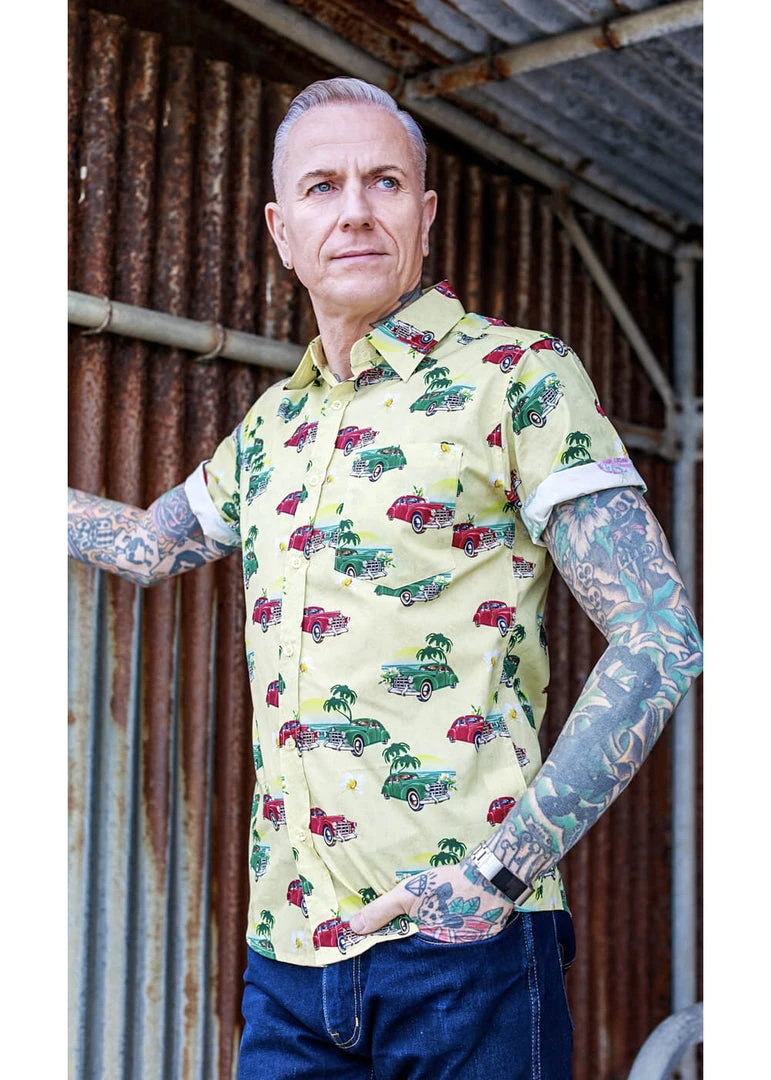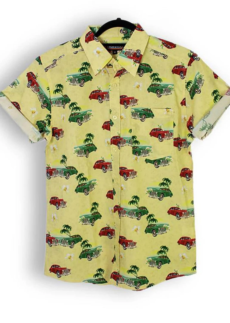 These festive shirts are made of an airy 100% cotton and will draw attention from a mile away thanks to the brilliant motive of cars on a summery yellow background. It has a collar, open chest pocket and closes using the smooth buttons on the front.