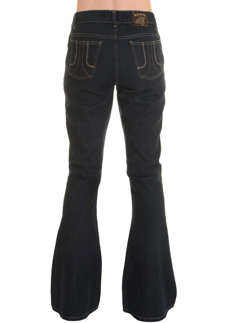 He seems to be coming from the 60’s or 70’s, with the denim-cotton without stretch in dark blue… This gem has a normal waist, a stright fit around the thighs, and flares widely from the knees down. It closes with a zipper and a button.