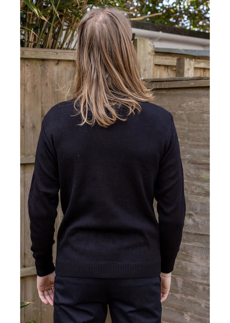 The longer model made of cozy 100% acryl is nicely warm and FAB at the same time 😉 The ribbed seams at the bottom, neck and the ends of the long sleeves keep the warmth inside. This unisex, relxed fit ends around the hips.