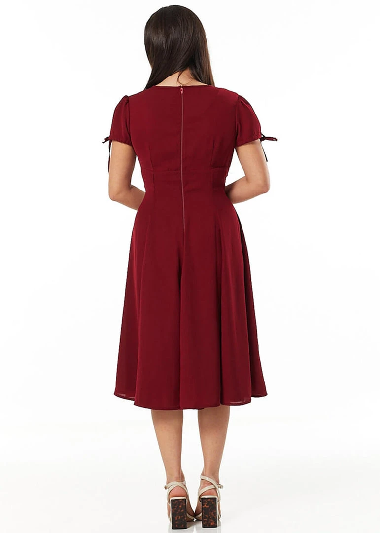 With her stunning burgundy colour, and black coloured embroidery she so elegantly represents the 30’s and 40’s, especially with that extraordinary neckline! The bows on the chest and sleeves complete this dress. She elegantly flows into a playful skirt that with a height of 1.70 reaches just on or over the knee.