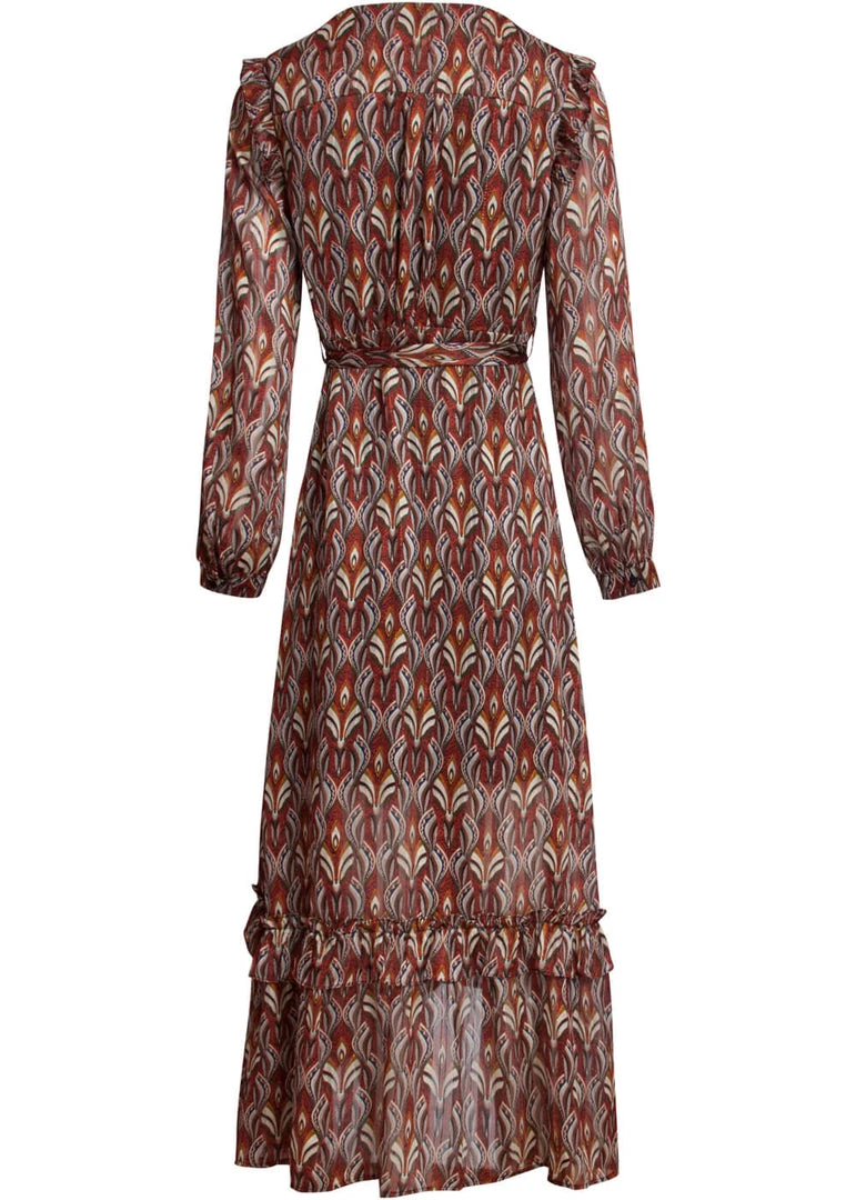 She’s a true retro-gem with her earthy colours and lurex that gives her a subtle gloss. And then the model, wow… She has an enticing v-neck, that you can see best in the pictures with the model, because the lining of the upper back has the same pattern. She flares into an elegant skirt that falls almost to your ankles for a height of 1.70m and she closes with a zipper on the side.