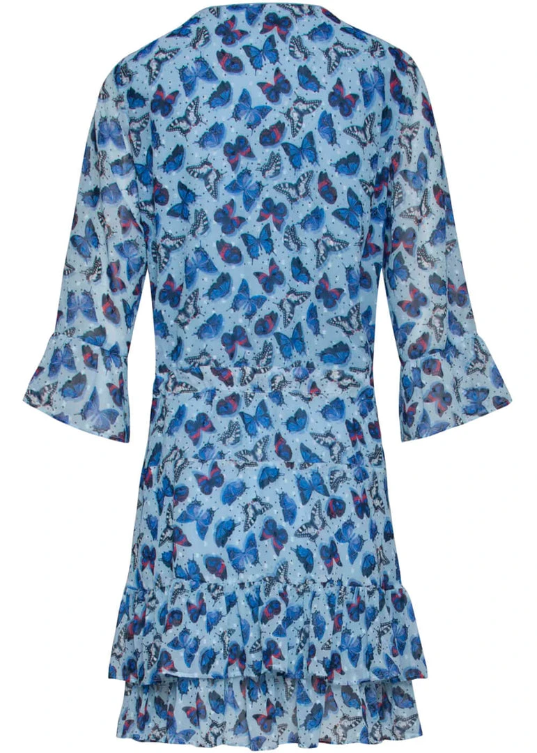 Butterflies on baby blue chiffon without stretch, that is also adorned with fabric dots: a 60’s dream coming true… She is completely lined, except for the half long, flaring sleeves. The v-neck is adorned with piping.