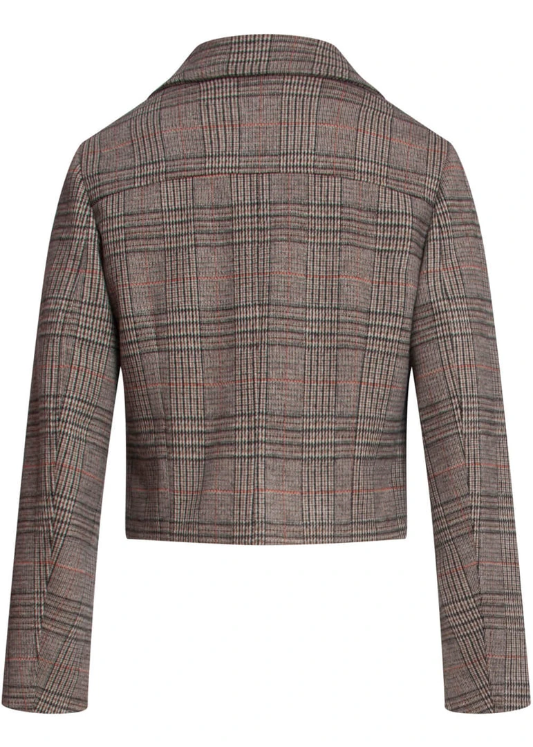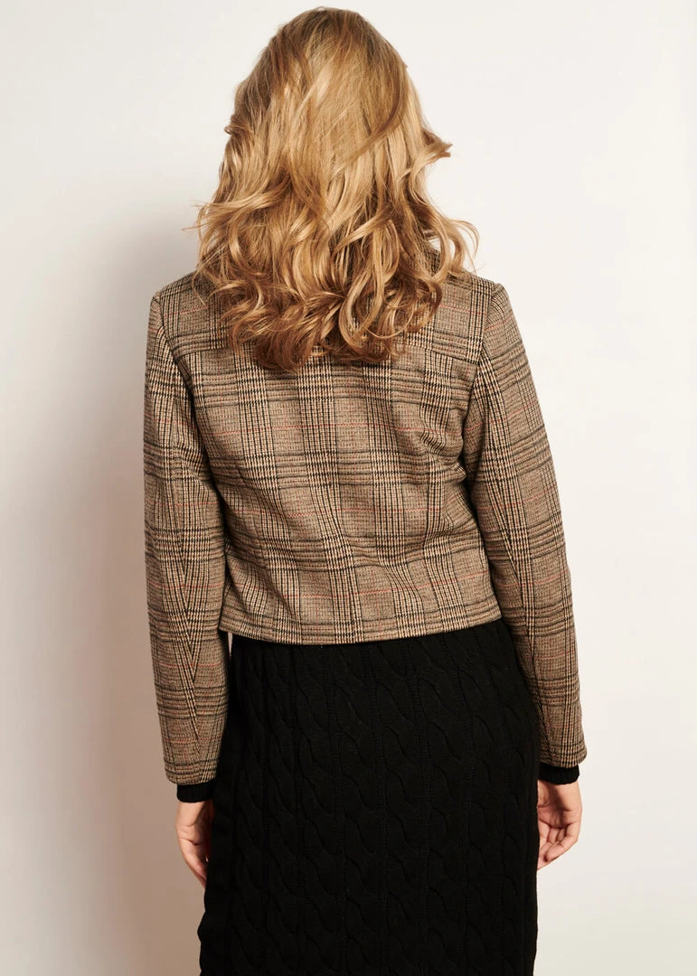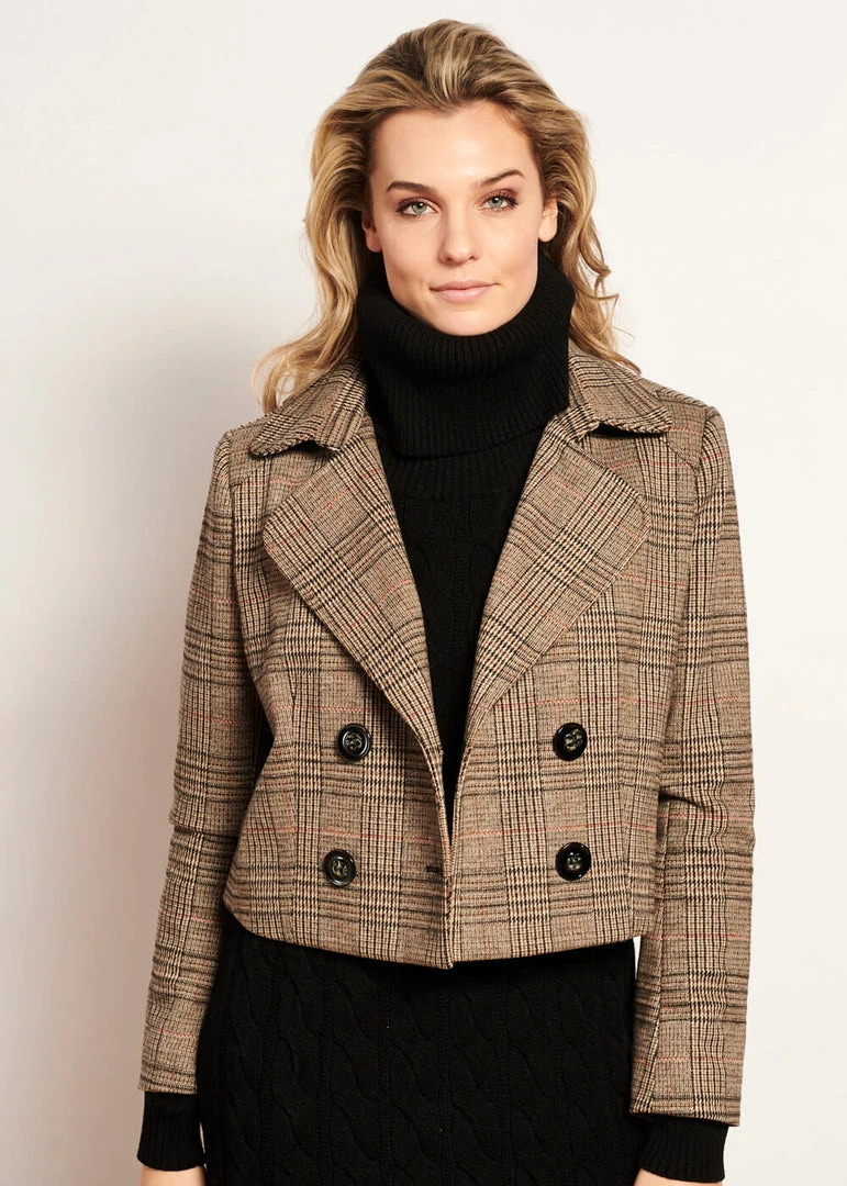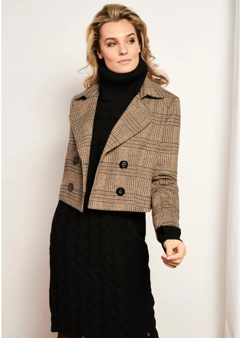 Business chic, but not too serious, that’s the look of this jacket. Thanks to the wool in her polyester-mix with stretch, you can wear her as an outside jacket, but also as a blazer over a breathable blouse. Her big collar transforms into an overlay at the chest, that closes with a double row of buttons. The long sleeves are a nice contrast for the short model, which ends around the waist.