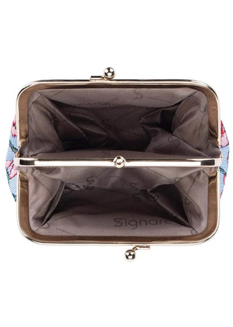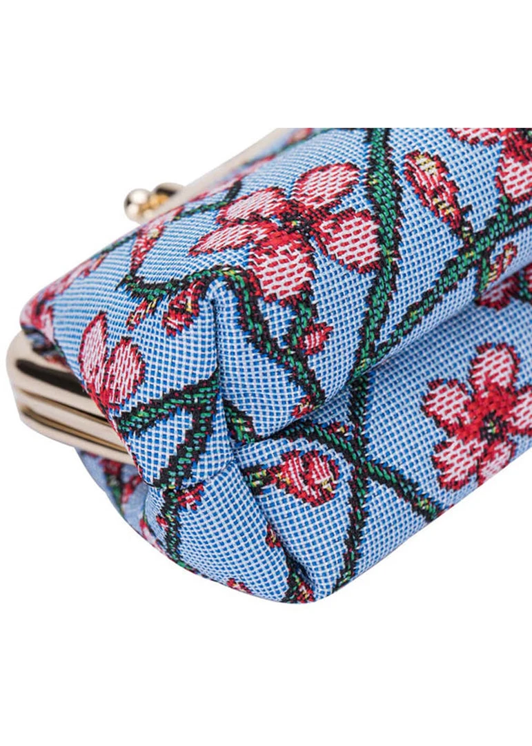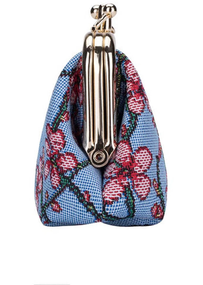 The outside is adorned with the famous ‘Blossom & Swallows’ by Crane on gobelin fabric. With her width of 12 cm and the 2 compartments, she’s perfect for your change, folded bills or small jewellery. She closes with a charming kiss-lock.