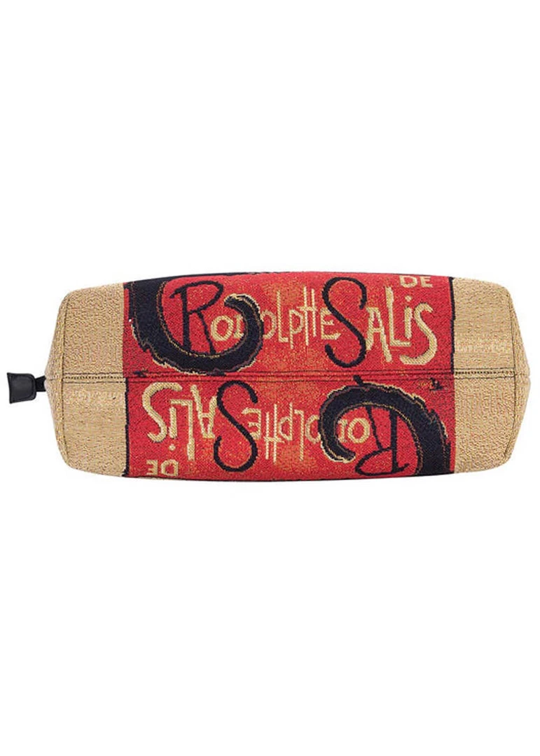 The outside is decorated with the iconic ‘Tournée du Chat Noir’ by Steinlen on fabric. It closes with a zipper on the top, where it also has a decorative faux-leather edge.