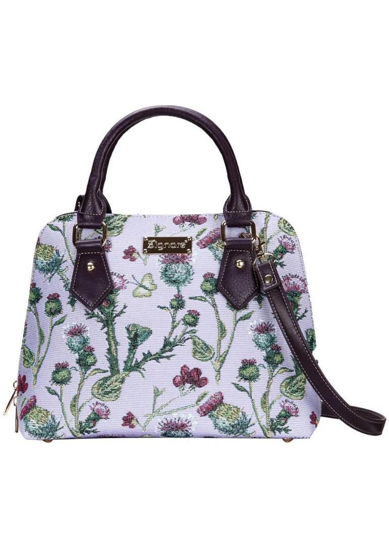 The outside is adorned with a classic pattern of thistles, the national flower of Scotland, on fabric. The bag closes with a zipper all around and has studs as feet at the bottom.