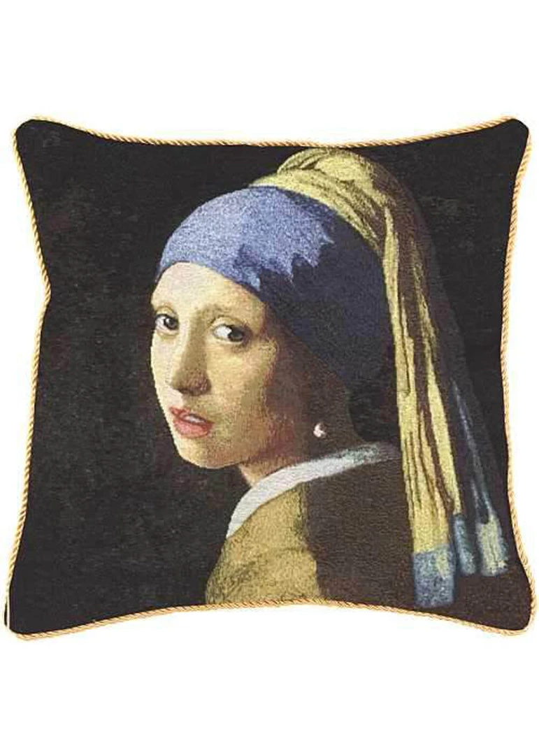 Both sides of this pillow case are showing the’ Girl with a Pearl Earring’ by Johannes Vermeer. It’s made of a heavy gobelin cotton mix, double stitched and has piped edges.