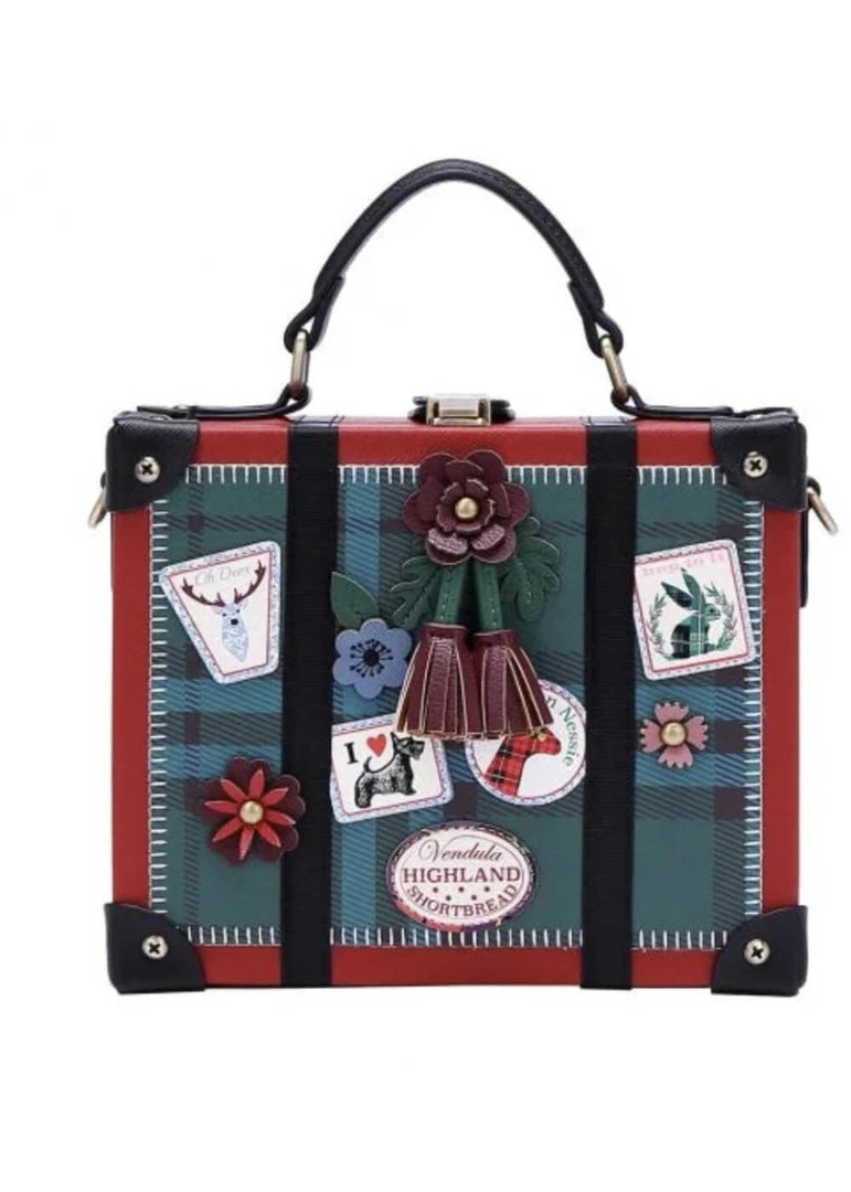 She’s like a true vintage travel case with Scottish tartan and gorgeous 3-d applications made of faux-leather. With her 21 cm width, she’s big enough for a travel guide, a small bottle of water, your phone and all essentials. Her hard case keeps its shape, her corners are reinforced. Just like a real suitcase, she has 1 big compartment on the inside with 1 zipped pocket and a small open pocket for your passport.