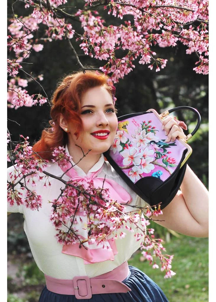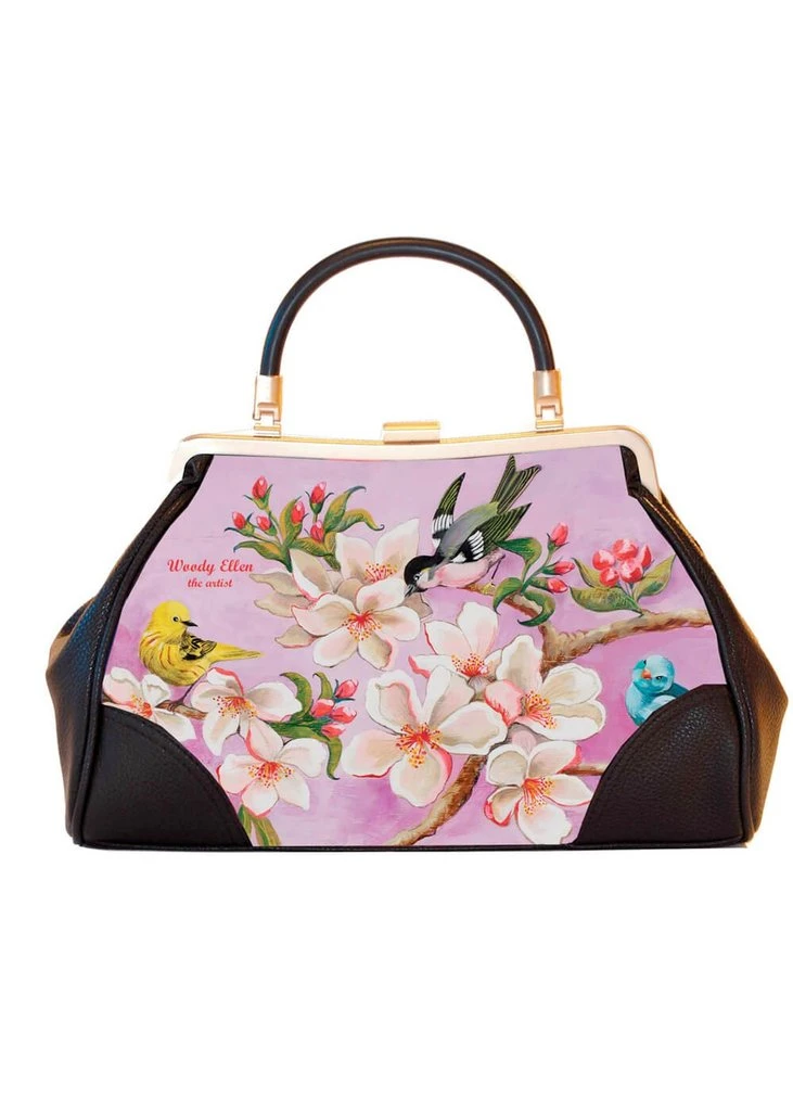 Get carried away by this calming picture of flowers and birds, on a soft purple background…. The art is displayed on either side and is printed on a waterresistant-microfiber, perfect for the environment 😉 The side and botton are finished with a high quality vegan-leather.